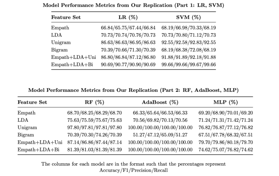 The table compares classification accuracy from Tadesse et al. (2019) with this replication. It focuses on SVM results for direct comparability, though AdaBoost and other models also performed strongly. Note: the original paper used LIWC2015 to categorize words into psycholinguistic categories, while this replication used Empath as a comparable alternative.
