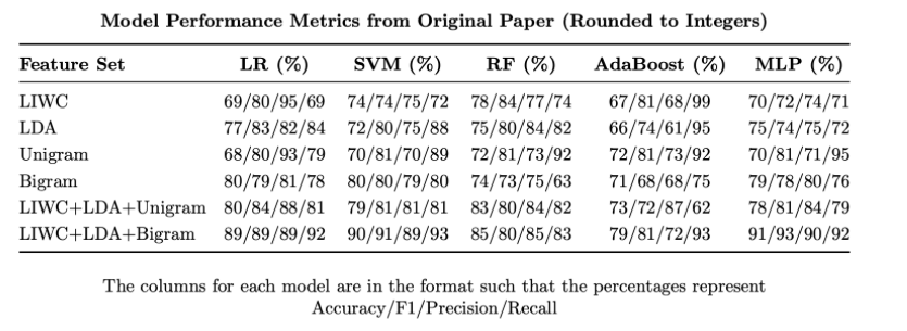 The original paper built models using Empath psycholinguistic features, n‑gram frequencies, and LDA topic distributions. My replication follows the same steps and compares results; differences are discussed in the accompanying PDF.